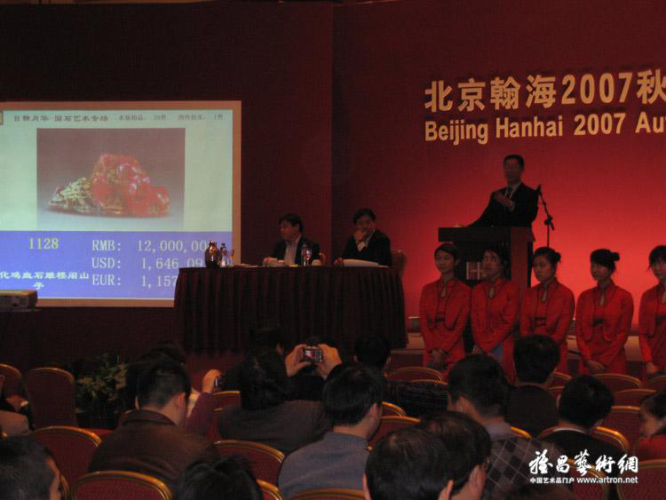 2007¦~12¤ë16¤é¥_¨Ê¿«®ü©ç½æ·|¤W¤û§J«ä§@«~½l³y¤¤°ê·í¥N¤uÃÀ¬ü³N«~³Ì°ª¦¨¥æ°O¿ý¡C A piece by sculptor Niu Kesi on a precious chicken blood stone was sold at a record price - more than 1.8 million US dollars at Hanhai, the leading auction house of China, 2007. |