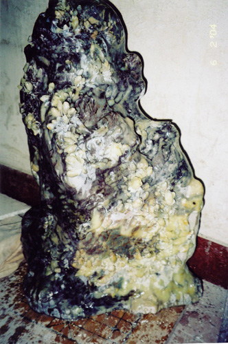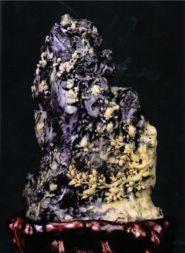 本件作品石料是青田紫檀凍,光潤結實,寶氣內蘊,青白玉色,呈片帶狀,更有散點紅色,恰似雞血。主體石料,為鐵青色,堅蒼秀潤,猶如青山雨濕,有“雨後千山鐵鑄成”之雄沉。江南初春,山雨山煙,似濃若淡,最為空靈迷蒙。早春之晨,雨露醒花,晨曦啼鳥,正是生意盎然。江南民諺曰:“一年之計在於春,一日之計在於晨”。《春晨》之名,就此點化而出。創作手法,以惜石隱秀為宗。凍石中青玉雕成白玉蘭,挺秀皎潔,青隱白露。崖間樹窠,鳳尾長命鳥,有獨立銜花,清高自隱;有雙目對語,含情脈脈;亦有交頸示愛,相濡以沫。鳥之目、鳥之喙,巧色天成。翅羽雕工細膩,宛然沾露帶雨之潮潤。藏秀含蓄,高妙上法。《春晨》是石雕大師牛克思代表作之一。作品高32英寸,石料為青田封門礦區的紫檀凍,堅蒼秀潤;底座為天然的古樟樹根,高20英寸。創作時間為2002年初到2004年9月,是牛克思在中國美術學院雕塑系研究生班進修期間的作品。