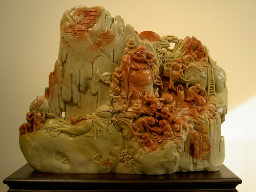 本件作品刻畫俗稱布袋和尚的彌勒佛歡樂祥和的樂天形象,故名《歡天喜地》。是牛克思首次採用壽山石雕的淺浮雕的技法創作的。布袋和尚名契此,號長汀子,是五代時後樑高僧。傳說他身寬體胖,面容含笑,出語無定,隨處寢臥,常以竹杖背一布袋入市,見人就乞,無論給他什麼,即裝入大布袋,永遠也裝不滿;有時在大庭廣眾面前,將袋中之物傾倒於地,叫道開:“看、看、看”,隨即哈哈一笑,收回袋內。一天,他坐在浙江奉化岳林寺東廊磐石上,說偈道: “彌勒真彌勒,分身百千億,時時示世人,世人總不識。”言罷圓寂而化。人們恍然大悟,以為此即彌勒菩薩顯化,因而從北宋開始,就畫或塑了他的形象,供奉于天王殿中,稱為大肚彌勒;有的還讓他帶著那個“布袋”,現在佛寺中笑口常開、袒腹露胸的彌勒菩薩像,即由此而來。《歡天喜地》刀法純熟,線條圓勁,原石為接近正方的的扁狀石料,顏色為青色和紅色相間。藝術家在創作構思時,以紅色的部分雕刻人物,正中間突出站定的布袋和尚,渾身猶如彤雲簇擁,霞光四射,周圍有一群天真活潑,歡快可愛的童子。童子們神態多姿,有與布袋和尚親近的,抱腿摟肩,無拘無束,有提水爬梯,為大象沐浴的,有推拉人參的,其中寓含了“太平有象”和“人生如意”的吉兆。